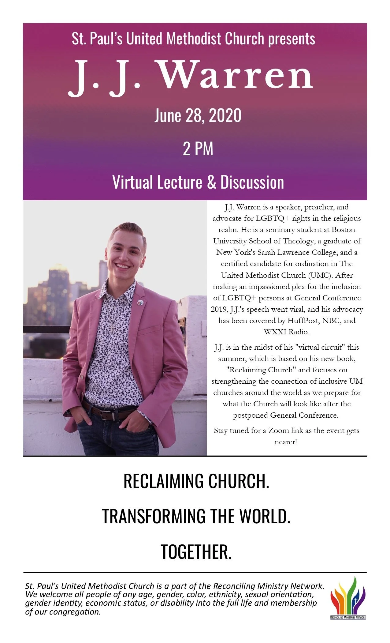 Join J.J. and St. Paul’s UMC in Helena, MT, for a keynote address about his new book, Reclaiming Church, and the role of reconciling churches as we await the postponed General Conference.